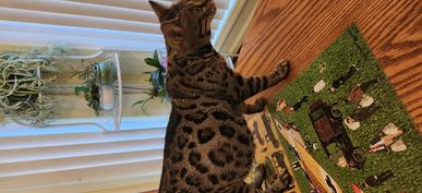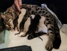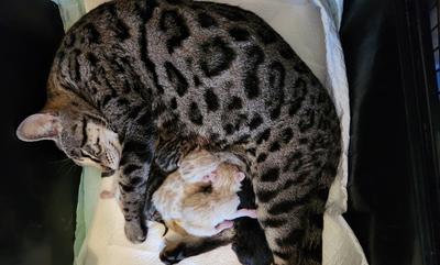 Cattelena and Airborne are expecting kitties in April. The kittens maybe charcoal, snow or brown rosetted tabby. A reasonable deposit will put you on the waiting list. These kits will be very sweet and have beautiful markings.