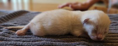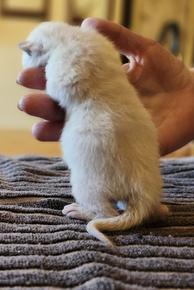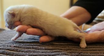 Seal lynx point (snow) kittens are often born white, as they age their markings and color fade in. With these kittens true markings are not fully expressed until the kittens baby coat is shed out and he wears his adult coat. By that time the rosettes have opened and color intensity is defined. The snows produced at Tailwinds have a history of desirable markings, rosettes, with contrast and coloring that clearly define the markings. Some snow kittens are born with shadow markings that intensify with age. Birth color is really not an indication of adult coloring but can give hints of adult markings. SLP Bengals have beautiful clear blue eyes.