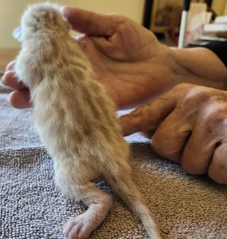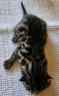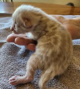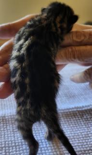 The centers of the spots are starting to "fall out" giving a hint of the beautiful rosetting these kittens actually have, even rosetted tails and wonderful wild chaotic placement of markings. Their coats are beautiful short tight pelts. They will have darkly outlined rosettes with light centers on a highly contrasted back ground color. The kittens are much prettier in person!